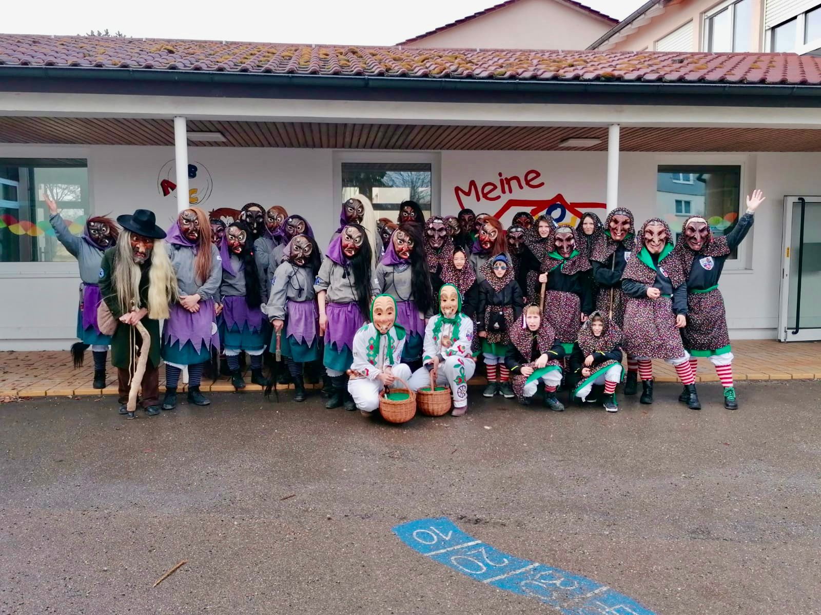 In diesem Jahr gestalteten wir eine gemeinsame Fasnetsfeier mit beiden Schulstandorten. Nach dem Fasnetsgottesdienst ging es schon gleich mit dem närrischen Treiben in der Turnhalle los. Mit verschiedenen Tänzen und Spielen hatten wir jede Menge Spaß miteinander. Wir bekamen sogar zahlreichen Besuch von den Narrenzünften aus Äpfingen und Laupertshausen, die mit uns getanzt und lustige Sachen gemacht haben.